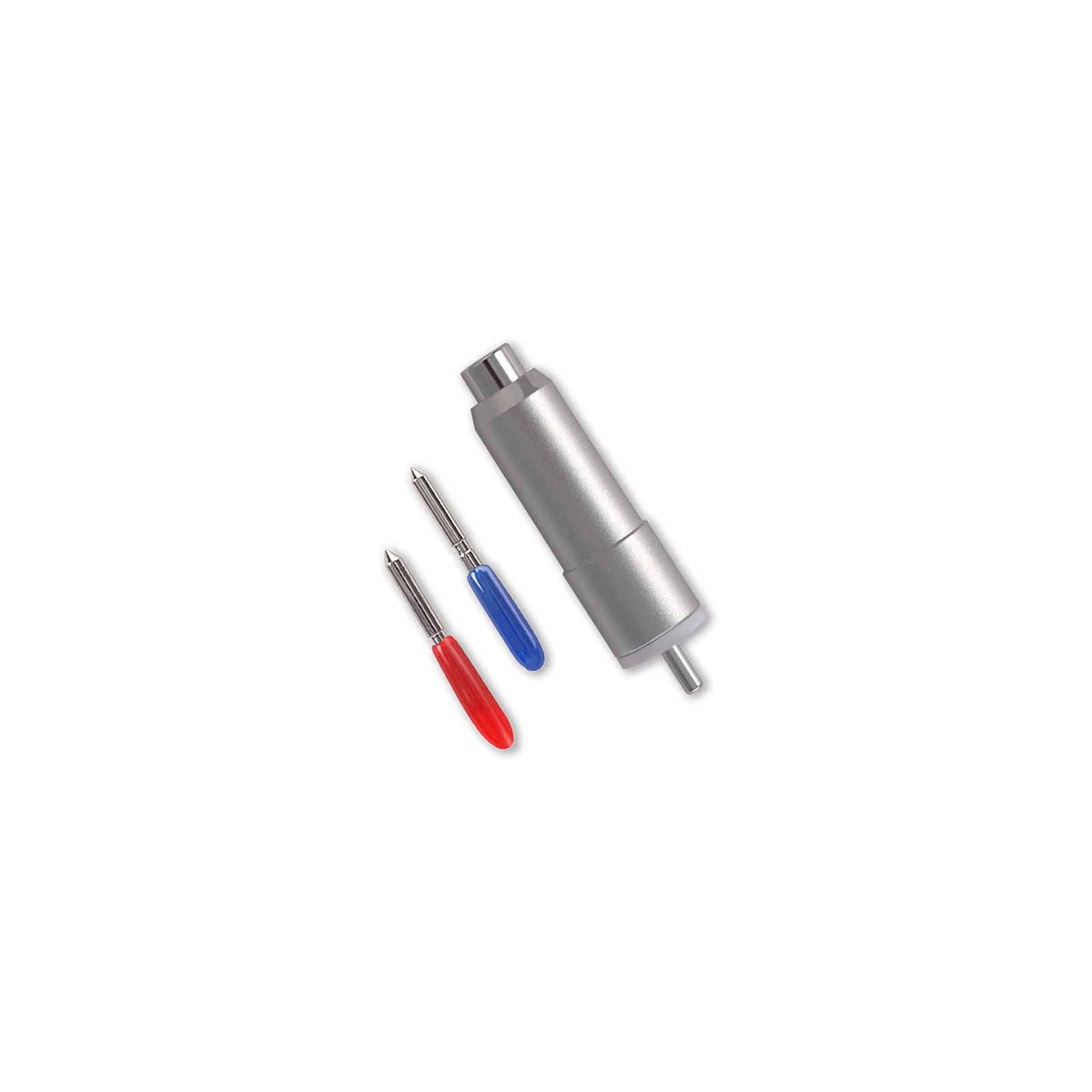 Комплект сочетает два ножа с разными углами заточки и держатель для безопасного использования. Лезвие 45° с красным колпачком подходит для бумаги, картона и самоклеящейся пленки, а нож 60° с синим колпачком справляется с фетром, магнитным винилом и другими плотными материалами.